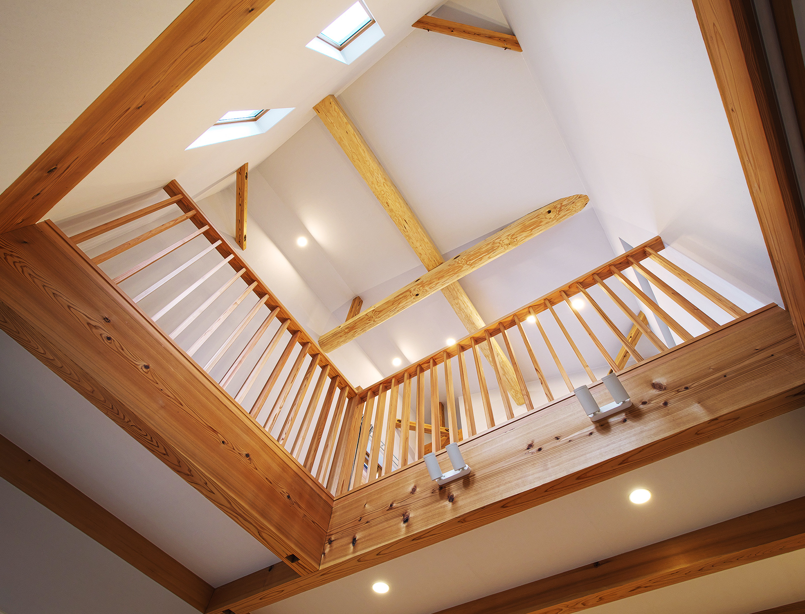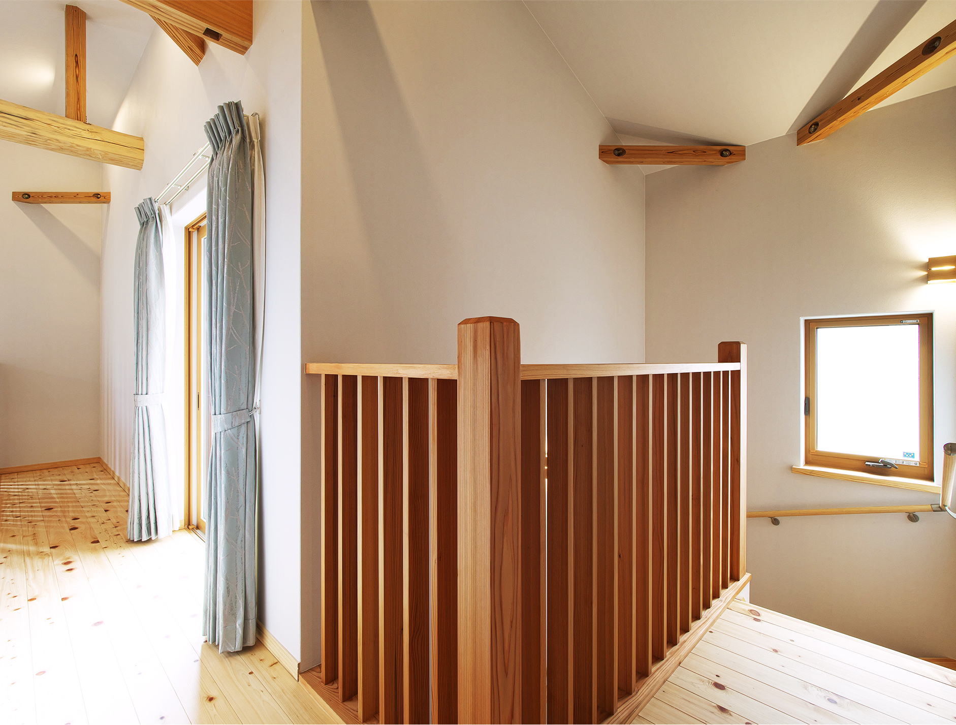 吹き抜けに面した二階は壁ではなく、木材の欄干にすることで