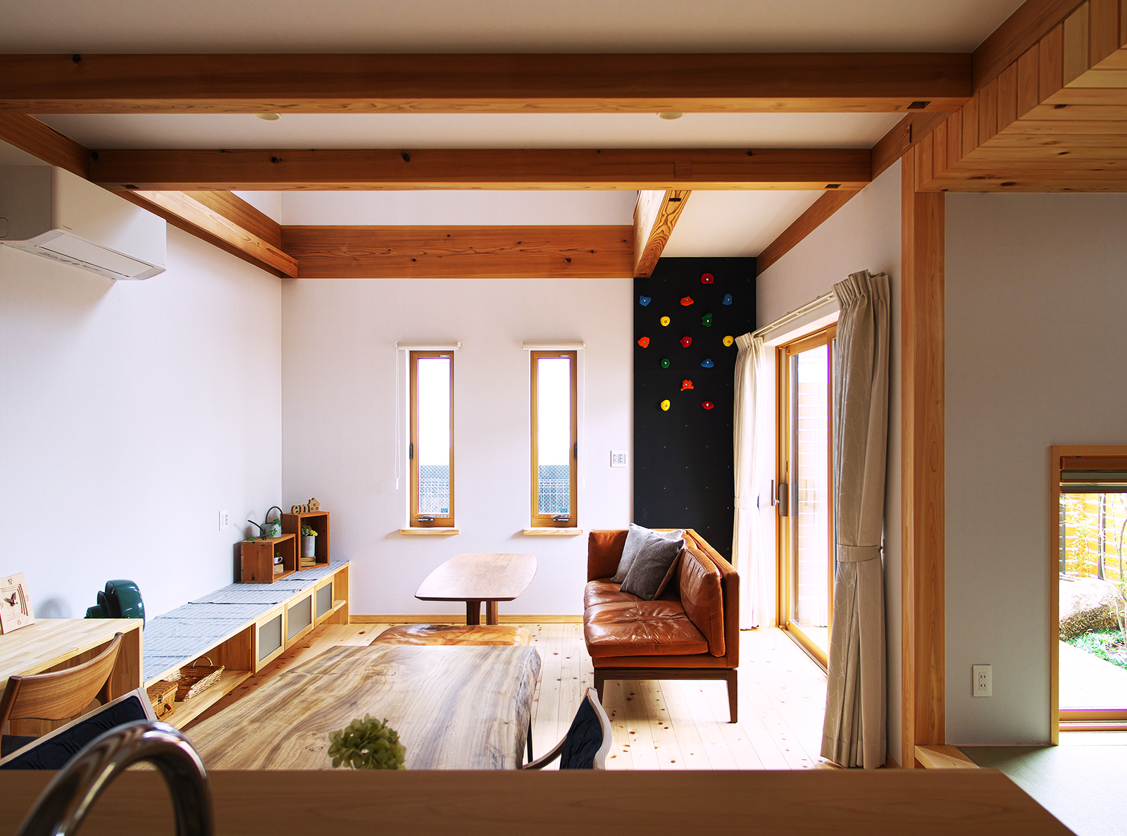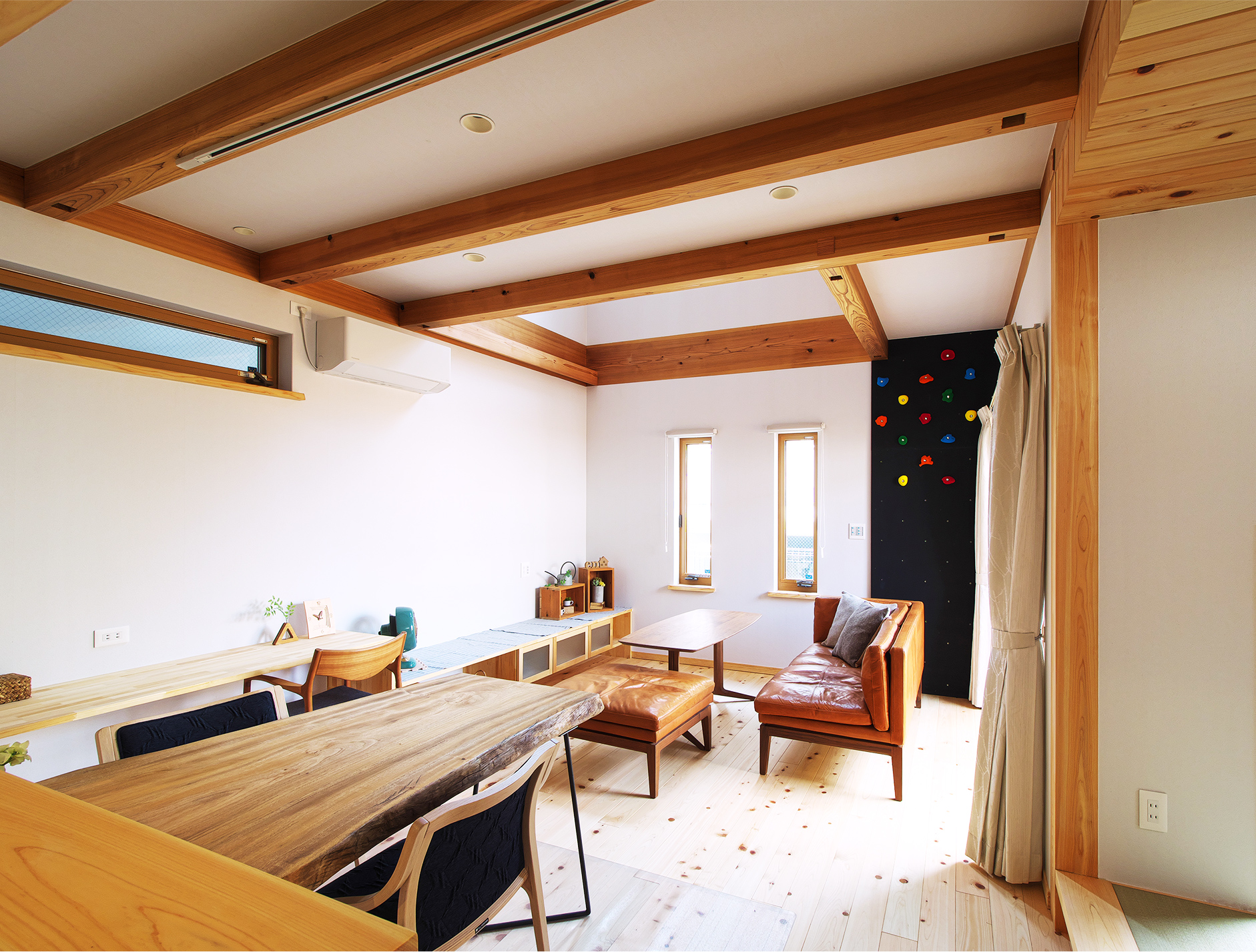リビングがお子さん達の遊び場にもなるよう、小さなクライミングウォールを設置されました。