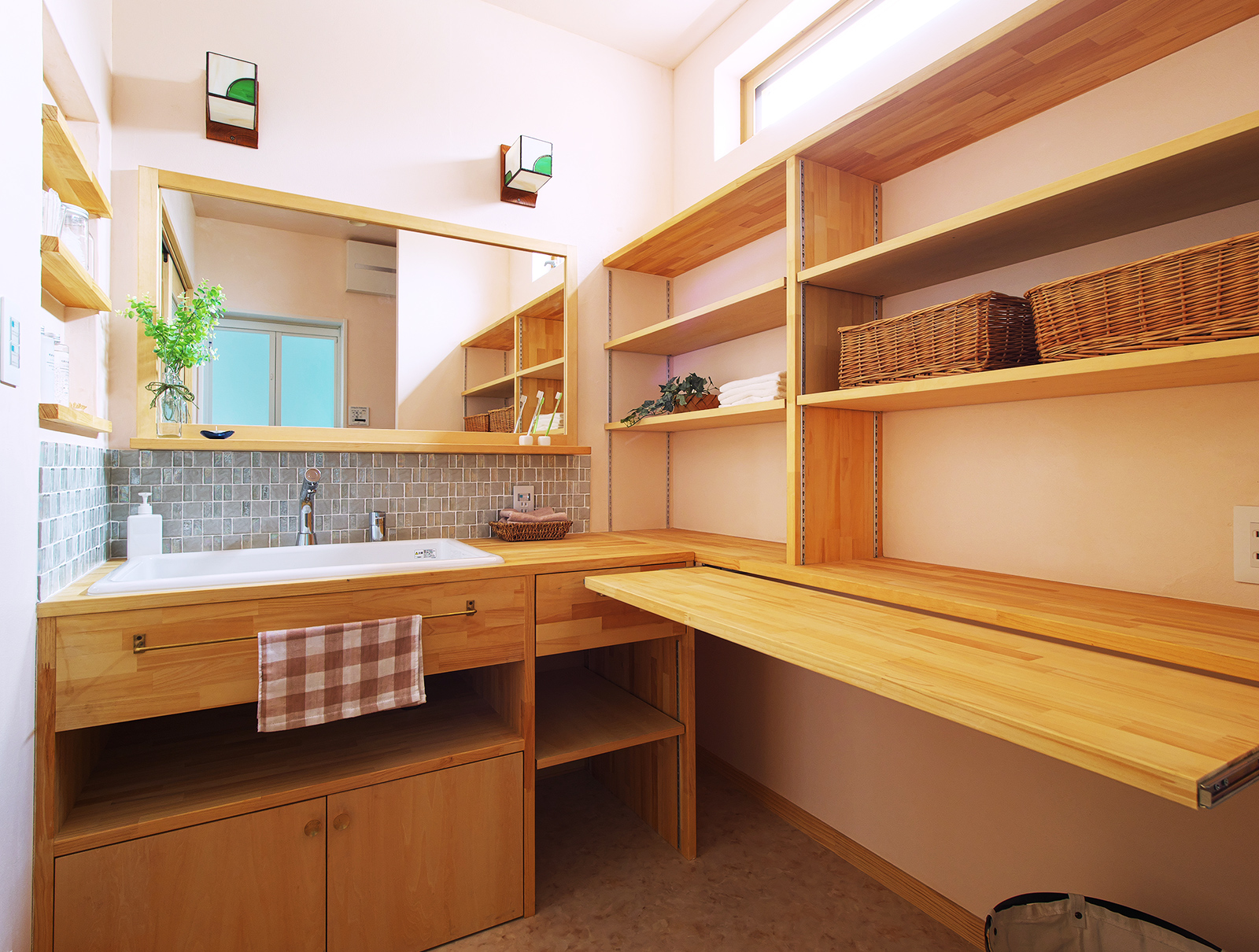 洗面所にはアイロンがけや洗濯物の整理などができる作業台を設けました。